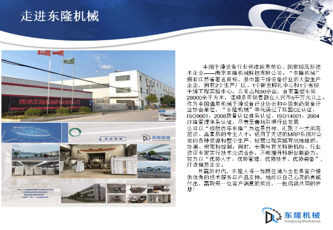 公司主要從事干燥、制粒、包衣、混合類設(shè)備和配料等系統(tǒng)成套設(shè)備的制造,公司擁有強(qiáng)大的非標(biāo)設(shè)備設(shè)計(jì)、制造及工程能力,成果頗豐,業(yè)績(jī)卓著。